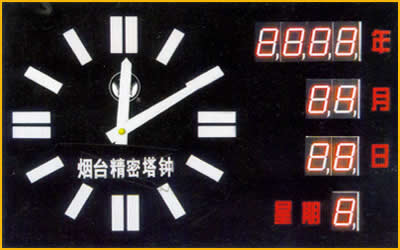 一、JM-S1型单(双)面万年历时钟    该产品采用超高亮度LED数码管显示,可显示北京时间“年、月、日、周”及“时、分、秒”及温度,可选用卫星校时,微机监控等功能。 二、JM-S2型倒计时钟   该产品采用高亮度LED数码管或像素管显示,可依据要求显示距某特定时间还有多少“年、月、日、时、分、秒”,可选用卫星校时,微机监控等功能。