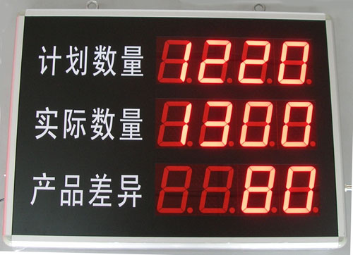 RC-DK型键控电子看板 生产线用键控电子看板,由按键或串口设定生产计划,可通过按键、继电器、光电开关、接近传感器的脉冲记录完成数量,差额数量由看板自动计算,计数准确,性能可靠,可以实现掉电数字保存,完成的数据不会丢失。适用于工厂、车间、生产线的信息显示和统计