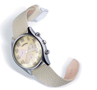 全不锈钢表壳 淡黄色魔鬼鱼皮表带 单拱形水晶玻璃 象牙色光面 50米水深防水