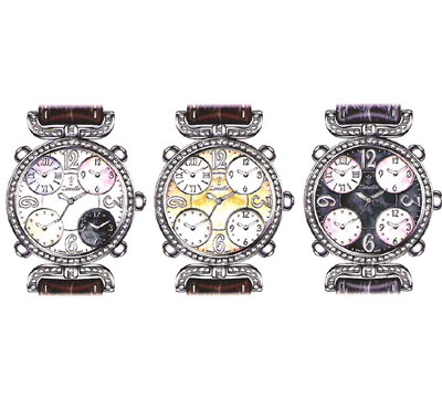 瑞士RONDA751(4PCS).RONDA753(1PC)机芯.表壳镶280PCS1.0mmVS1镶石,约1.4卡.蓝宝石玻璃.全球五地时区.316L不锈钢壳,5ATM防水表.多色MOP面.换带结构(配男/女装带各一套).意大利四脚蛇冰皮表带. 外观专利设计(已注册).